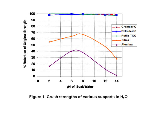 Choice of support has a tremendous impact on catalysis performance and stability. We have shown granular and extruded carbon supports to be particularly stable to hydrothermal conditions as measured by crush strength versus silica or alumina supports (see Figure 1). Rutile Titanium has also shown high strength. Granular carbons have a very different pore structure than carbon extrudates which can impact catalyst performance.