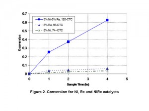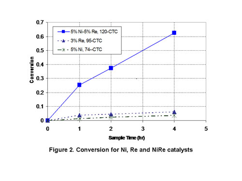 In the example of upgrading of sugar alcohols the support plays a role on selective adsorption of reagents and products. In addition to the support, the interactions between nickel and rhenium play a pivotal role in the catalyst. An extreme example of the reactivity difference is shown in Figure 2 (batch conditions, 200 °C, 1200 psig H2). In addition to nickel and rhenium we will also discuss results with silver, copper, and ruthenium. Finally, using two additional systems we will highlight general technical challenges drawn from our work with fermentation products.